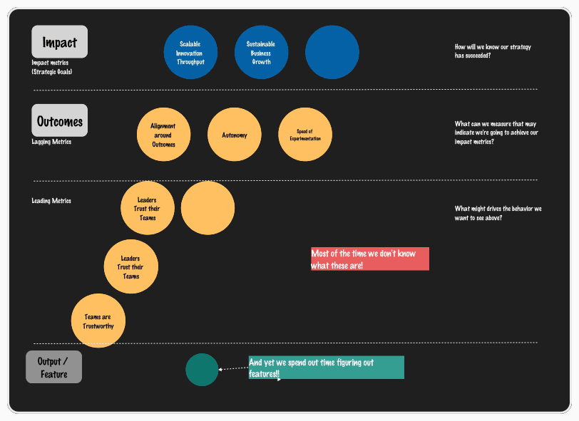 But to get there, you need to define the behaviors you want to see. Instead of teams writing OKRs because they were told to, you want teams that understand the strategic context and can make decisions themselves. For leaders, it means providing clear intent and stepping out of the way, trusting teams to own the “how”.