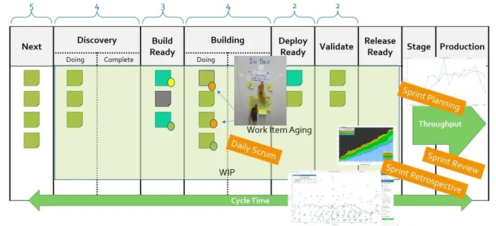 Sprint Review includes a review with stakeholders of both the Increment as well as overall flow behavior of the team — trends in Cycle Times and Throughput are interesting. Throughput can also be used as part of release planning/road-mapping discussions, especially when combined with Monte-Carlo simulations provide some better visibility/confidence into “What can be done by when”. NOTE: It is always important to emphasize that these are projections/forecasts, not commitments.