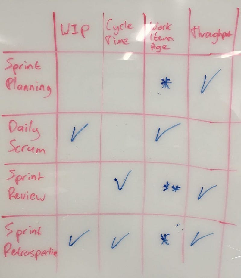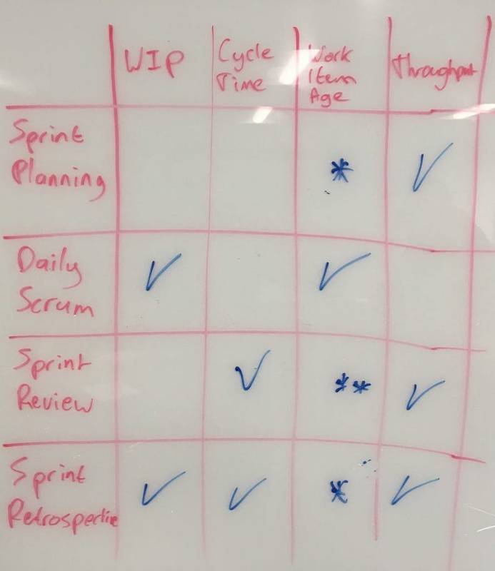 So how can these flow metrics be used to improve the Scrum events? This is one of the key learning objectives in the Professional Scrum with Kanban class. In a follow up discussion with some of the Professional Scrum Trainers who attended last week’s class, we came up with a matrix mapping the metrics to the events. (credit Maarten Kossen)