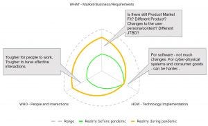Current times bring to the front a somewhat neglected axis of the model — WHO are the people on our team/group and what kind of interactions are they having. If the WHAT/HOW dimensions range from simple/known all the way to uncertainty and lack of agreement, when we look at the WHO aspect its about how effective are the interactions between the people. You could look at it as how far along the Tuckman model (Forming, Storming, Norming, Performing) they are. Drawing the three axis it kind of looks like an uncertainty spider/radar.