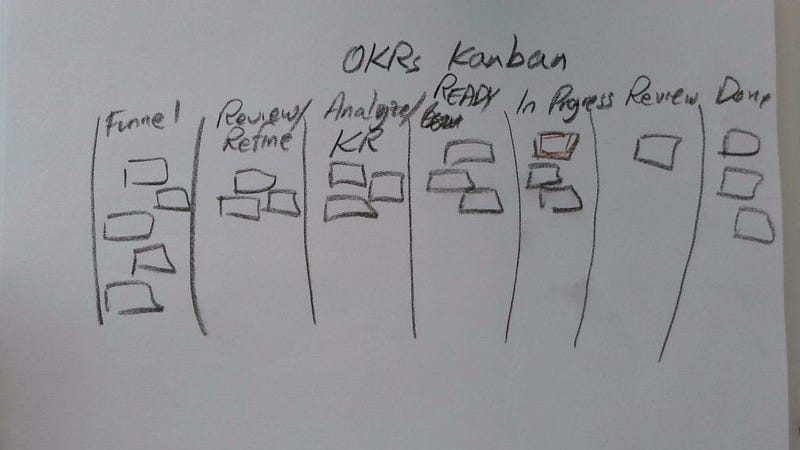 Maybe we should visualize the FLOW of OKRs through the funnel of considering them, prioritizing/refining, committing to them, working on them, reviewing, achieving… How about LIMITING and REDUCING the amount of OKRs in progress across the organization at any point in time — the alignment that OKRs promise relies on focus rather than trying to boil the ocean Next, let’s manage the flow of OKRs proactively. Maybe even use some metrics like OKR cycle time, throughput, WIP, and aging. Let’s inspect the flow from time to time. We might learn a few things. Maybe we should adapt the definition of how these OKRs flow and how we’re managing them.