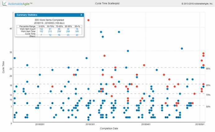 Cycle time is mentioned briefly in SAFe but the SAFe practitioner would benefit from taking a deeper look at charts/reports used to visualize and analyze Cycle Times like the Cycle Time Scatterplot where teams can understand their Cycle Time trends, distributions, look at anomalies.